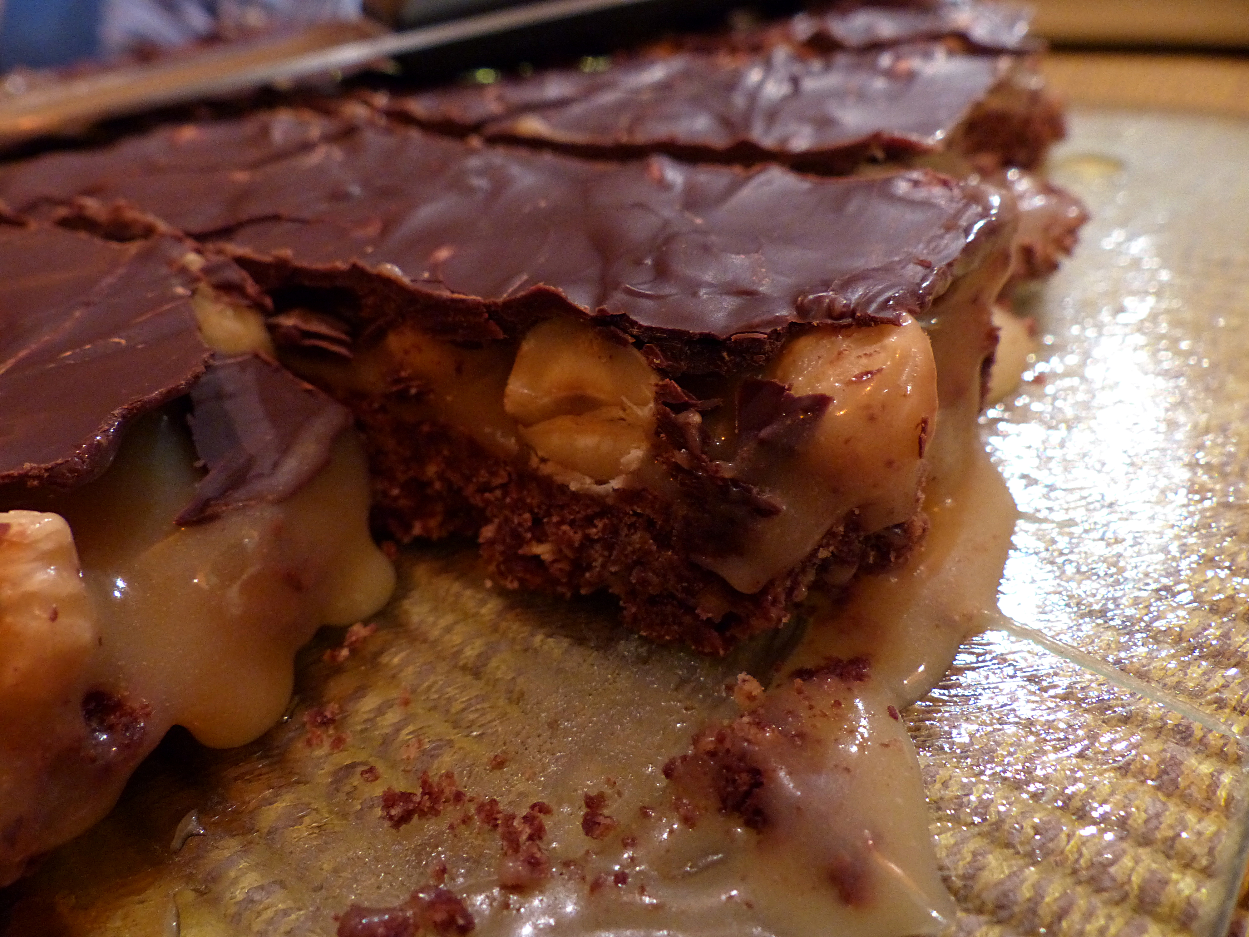 butterscotchlayerOnce the butterscotch mixture is done, add the roasted hazelnuts to it. Then you need to pour it onto the (now baked and cooled) chocolate dough. Make sure the hazelnuts are evenly spread out, like on the picture on the right.