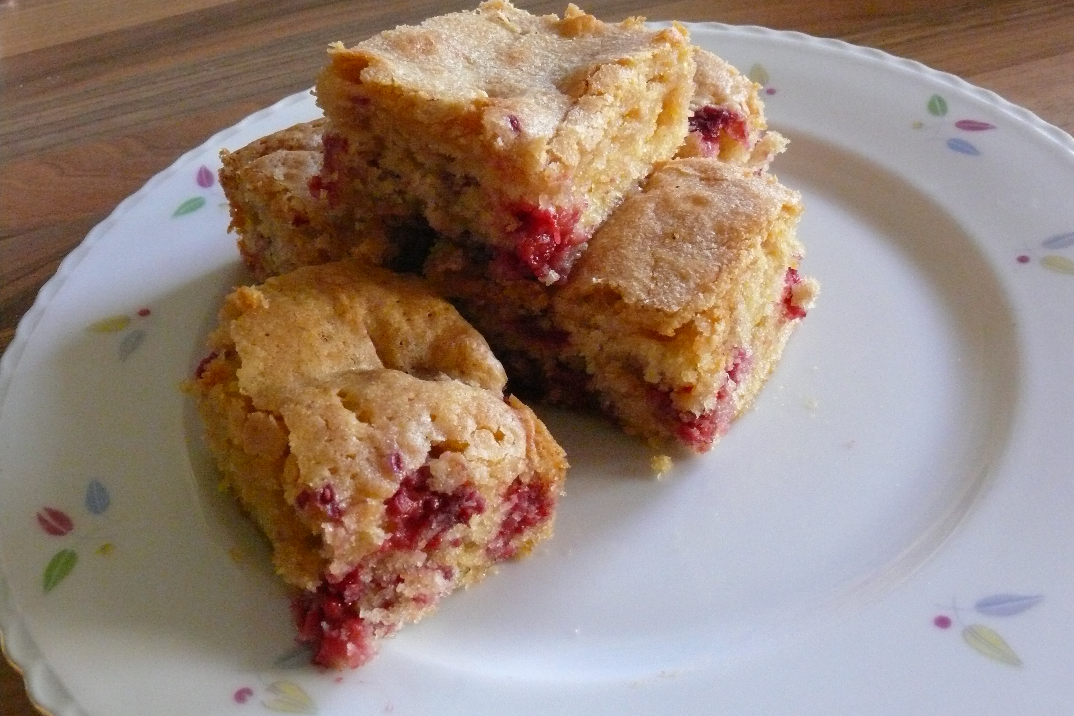 Today my aunt was having a high tea for her birthday, and I thought it would be nice to bake something sweet and simple to bring with me. I didn’t feel like baking my usual brownies, but I thought something like it would be perfect, so I made blondies! I’d never made blondies (“blond brownies” — brownies without the cocoa) bef0re but I figured it wouldn’t be that difficult, and they’d probably taste pretty darn good. And I was right! The sourness of the delicious raspberries complements the sweetness of the white chocolate and the sugar perfectly. I’ll remember these, that’s for sure!