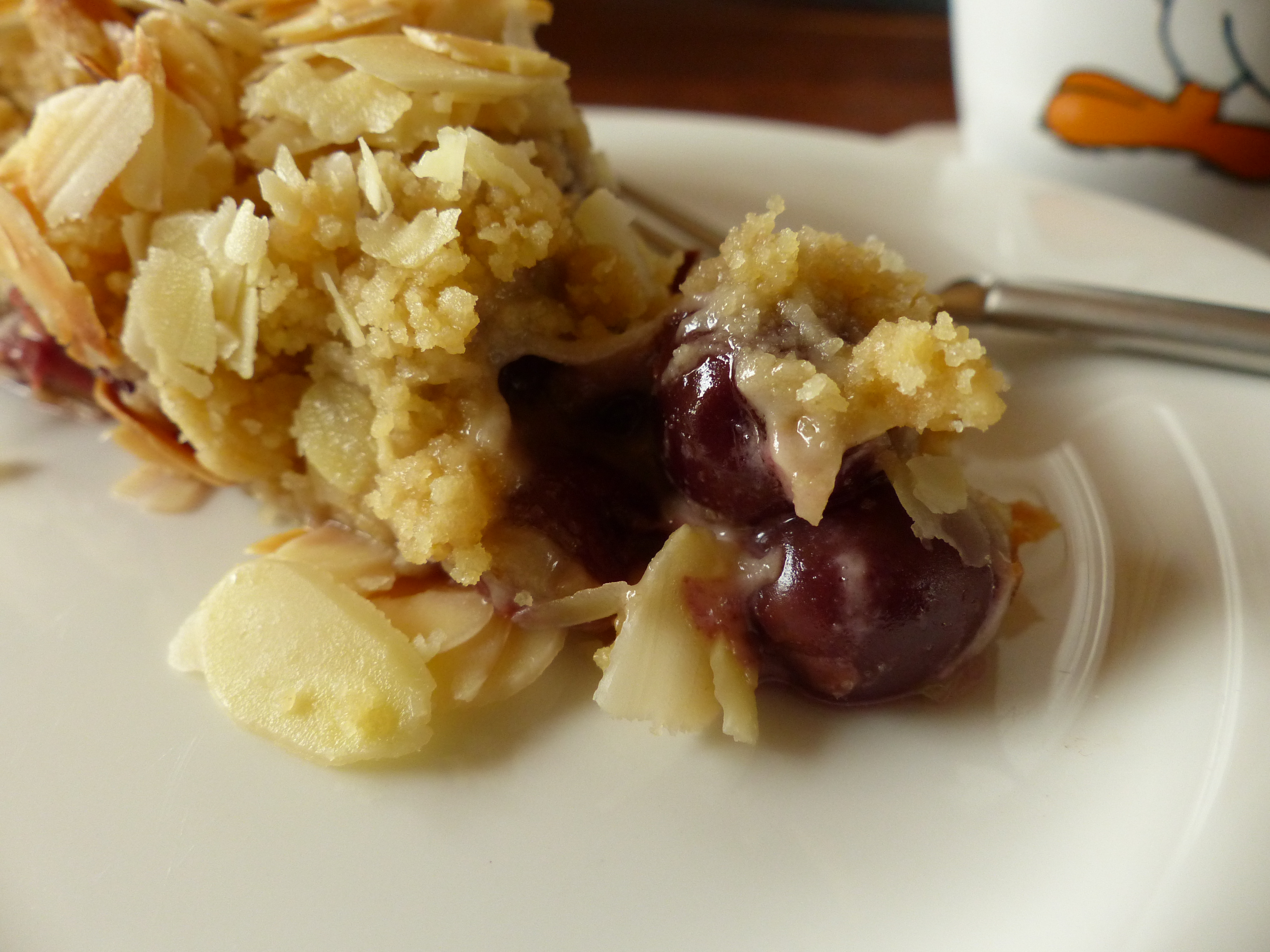 4. Divide rest of streusel mix and sprinkle almond flakes All that’s left now is the finishing touches: divide the rest of the streusel mix over the top of the cherries, and sprinkle the almond flakes over them. They’ll give a nice and crunchy effect!