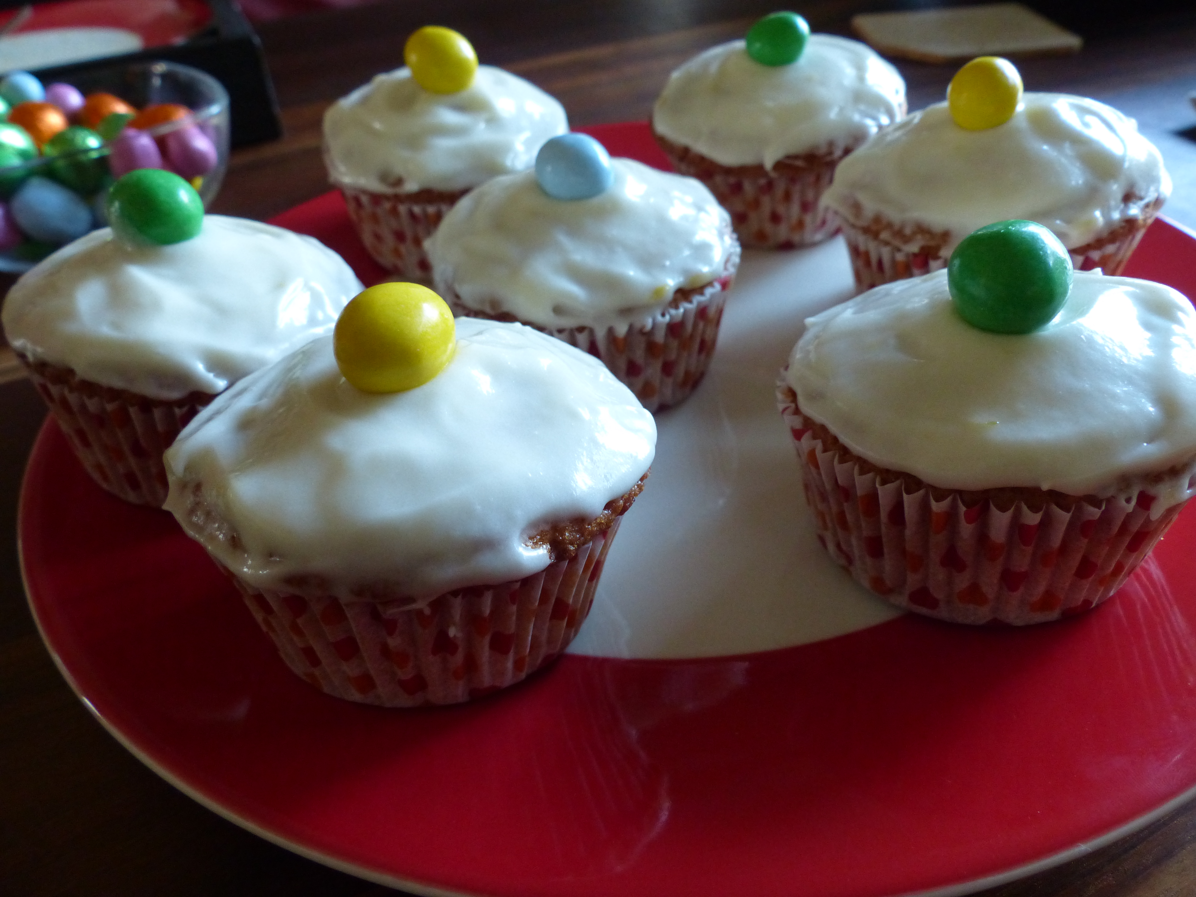 I had quite a bit of frosting left over since I don’t usually use a lot of frosting (and it was just too much), so I whipped up a small batch of cupcakes to coat with the remaining lemon frosting. I decorated them with the limited edition of Easter M&M’s.