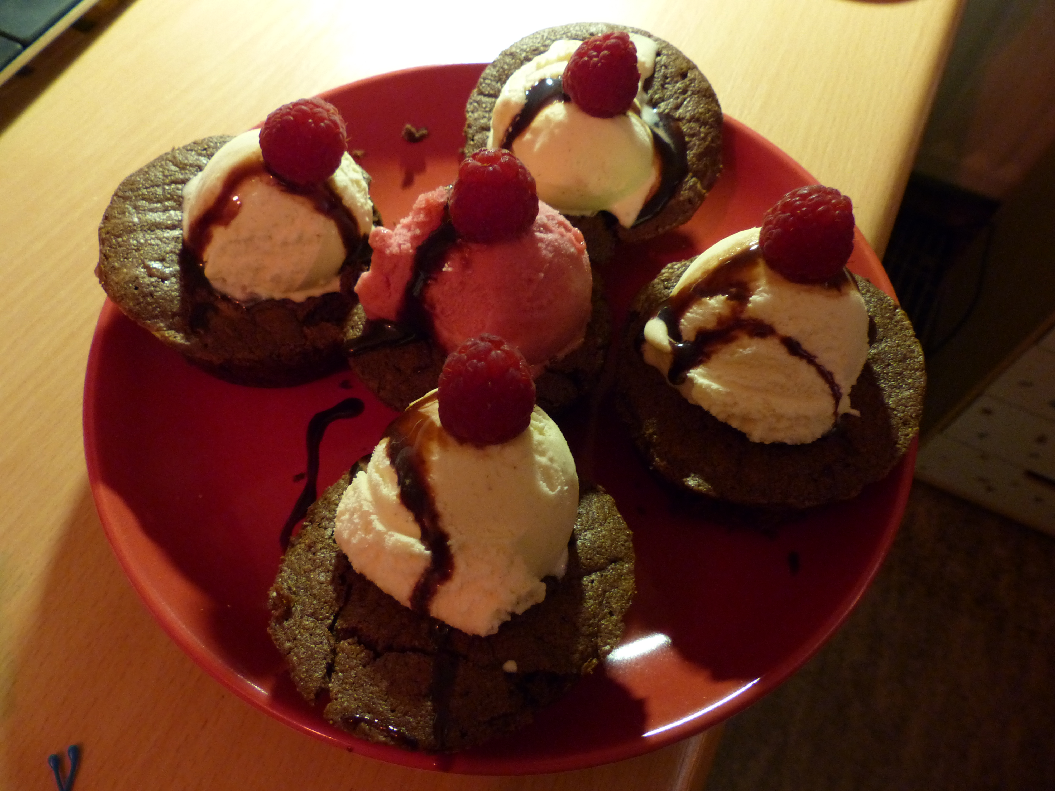 P1010740On Tuesday I celebrated my birthday with a few of my closest friends. They came over for dinner, and of course this called for another really great dessert. I had already figured out what I wanted to make a couple of weeks ago. It was something really simple but also really pretty and so tasty. I made a couple of brownies (recipe) in my muffin tin, added a perfect scoop of vanilla ice cream, and topped if off with some chocolate sauce and a fresh raspberry. One of my friends is lactose intolerant, so I bought raspberry sorbet for her, which also tasted really good. I was pretty proud of how it turned out to look!