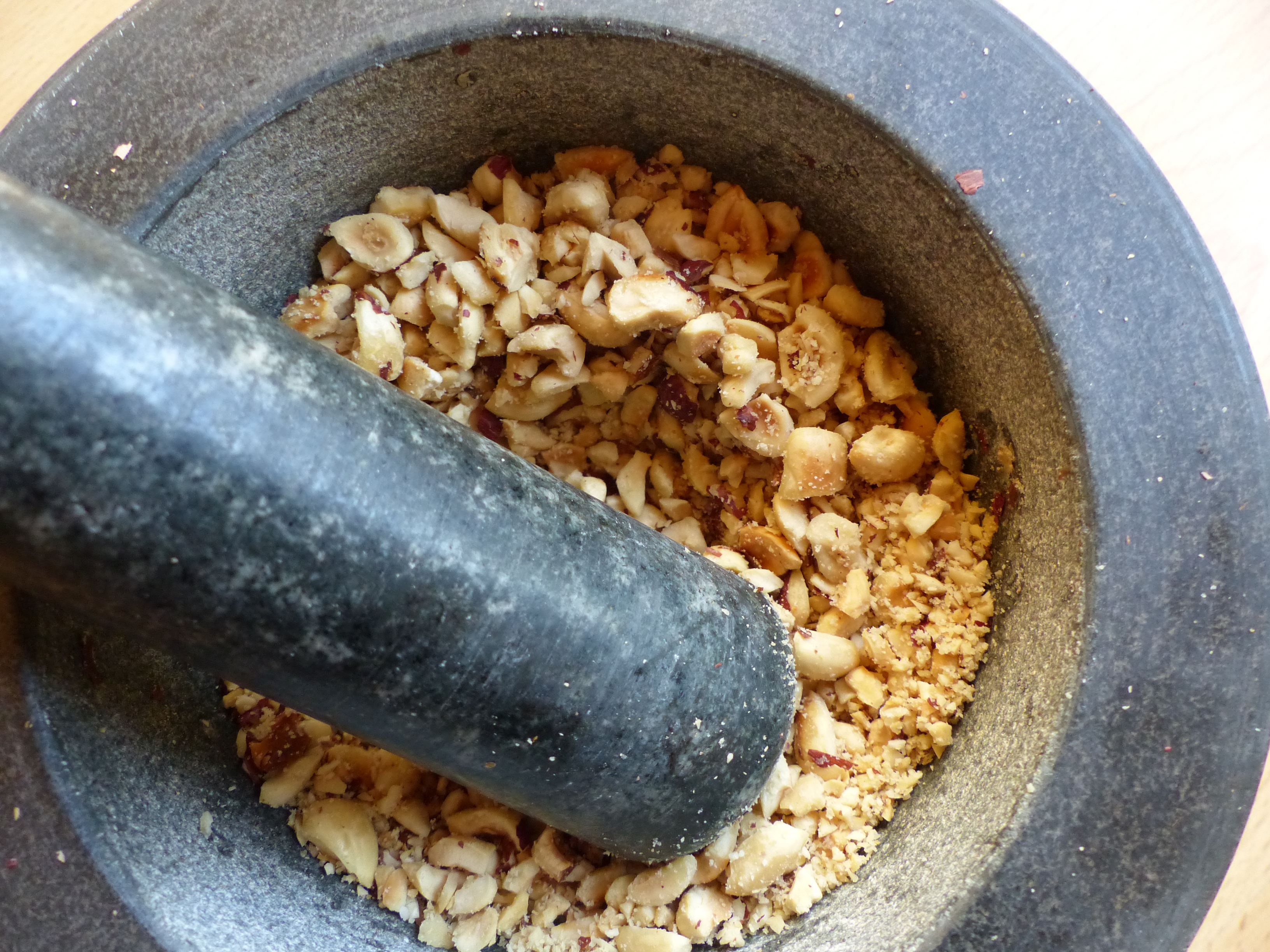 4. Add raisins and nuts Add your pecans, hazelnuts and raisins to the batter. At this point it’s best to start mixing with a (wooden) spoon instead of an electric mixer or a whisk, since all them nuts and raisins will just get stuck in it. Spoon all of the nuts and raisins through the batter, until they’re nice and evenly mixed through.