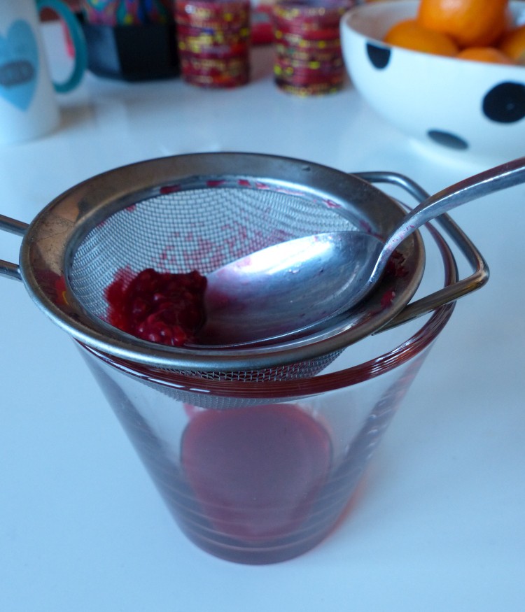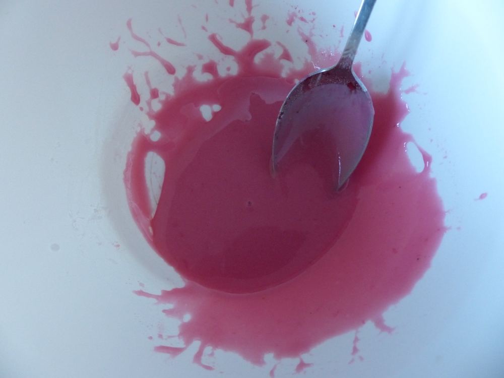 P10108106. Prepare the icing While your cupcakes are baking away in the oven, you can start preparing the icing. For the two teaspoons of raspberries you’ll need a (small) sieve and a glass, and “sieve” a few of the left over raspberries (not the pretty ones!). Just use a spoon to push the raspberries through the sieve. This way, you’ll end up with raspberry juice without any pulp. Get yourself another bowl, and mix the icing sugar and the two teaspoons of raspberry juice together. If needed, add half a teaspoon of water, or more, this is up to your own judgment. Same goes for lemon juice: add a few drops if you think the icing is a bit too sweet (as I did). If you like it the way it is, leave the lemon juice out.