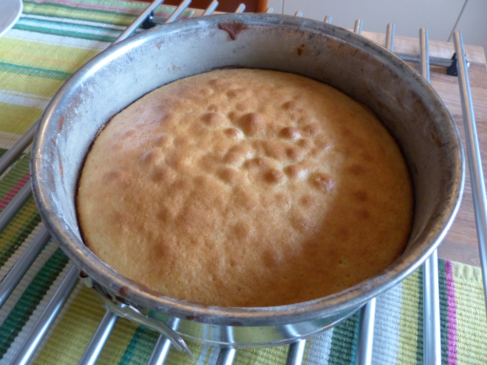 P10109674. Bake the cakes If your oven is big enough and you have two tins of the same size: divide the cake mixture over two cake tins (which you’ve lined with parchment paper and greased) and bake them together in the oven for about 20 minutes (they’re done when they spring back after you’ve gently pushed in the middle). I didn’t have two tins or a large enough oven, so I had to bake the cakes separately (and in the same tin). This works fine as well, you’ll just have to be a little more patient. If you do this, let the first cake cool for a while before taking it out of the tin. Then, clean the tin and line and grease it again before baking the second cake.