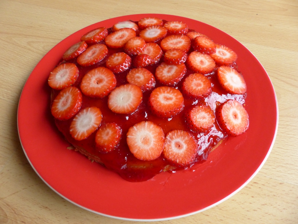 P10109906. Add jam, strawberries and whipped cream Once your cakes have cooled down completely, it’s time to add the rest of the ingredients. Spread the strawberry jam on top of the sponge you’ve decided to be the bottom one (the least pretty one, I’d say). Then, add slices of strawberries on top of the jam. They’ll probably want to slide off the cake, but that’s going to happen no matter what you do. Once you’ve covered the cake in strawberries, add the whipped cream on top of that and gently spread it over the strawberries. Then take the other sponge and gently put it on top of the whipped cream.
