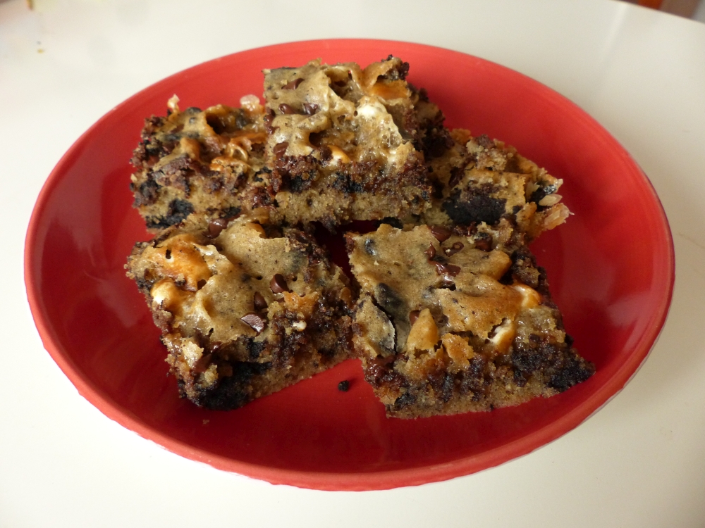Although they turned out different then I’d expected beforehand, these blondies are pretty delicious! They’re a little bit more compact than my previous blondies, which was a deliberate choice because the compactness is part of what I like about brownies so much, so I wanted to get the same effect with my blondies. That’s why I didn’t use any baking powder in this recipe. It certainly did the trick!