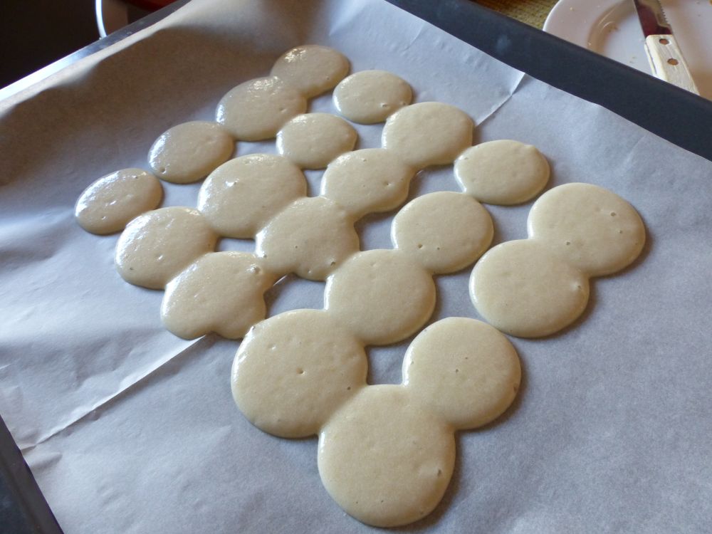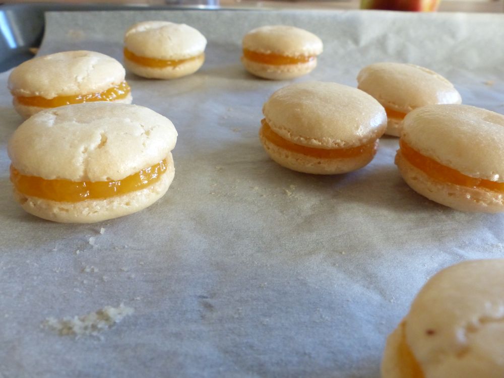 One big macaron. At least it has a foot, eh? I must have done something right. It was quite tasty, too, I must say. The part of it that actually came off the parchment paper, that is.