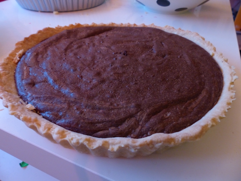 P103026413. Bake! Lower the oven temperature to 160 °C and put the tart back in. Bake it for 20 to 25 minutes, or until a skewer comes out relatively clean. The brownie mixture shouldn’t be dry, but it also shouldn’t be very wet anymore. If you think it’s done, take it out of the oven and let it cool.