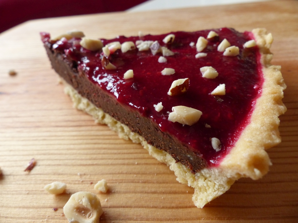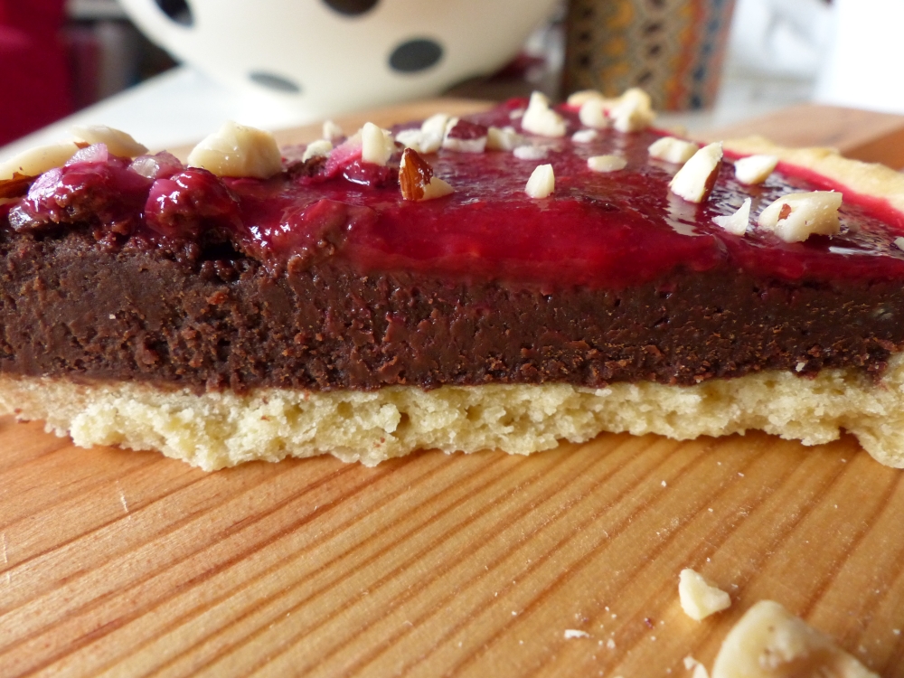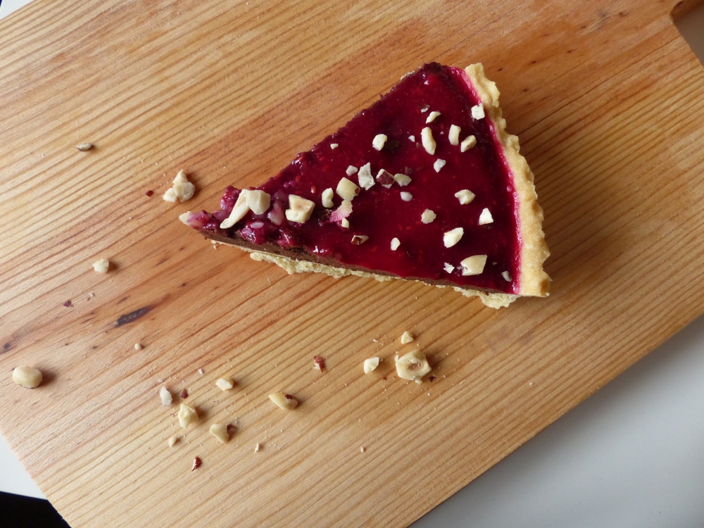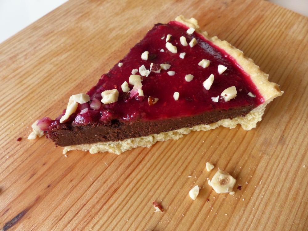 This tart was inspired by Tamal’s creation in The Great British Bake-Off during chocolate week, when he made a chocolate tart with raspberry coulis as well. Most recipes for chocolate tarts use a lot of cream or milk, though, and I couldn’t do that for this one, because one of my friends is allergic to milk. So I came up with the brownie idea and it worked splendidly!