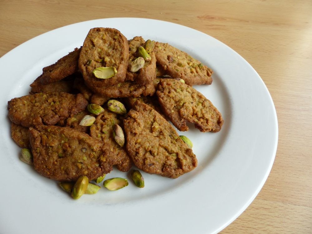These cookies turned out really nice! They are crunchy and yummy and the pistachio flavour comes through beautifully. It’s very easy to make them, and I used the slice and bake method, which means rolling the dough in a cylinder shape, chilling it in the fridge and then simply slicing it into cookies. I only let the dough cool for about 15 minutes (because I was impatient), so my cookies didn’t turn out very neat or round. However, if you want neat, uniformly shaped cookies, I recommend chilling the dough for at least 3 or 4 hours.
