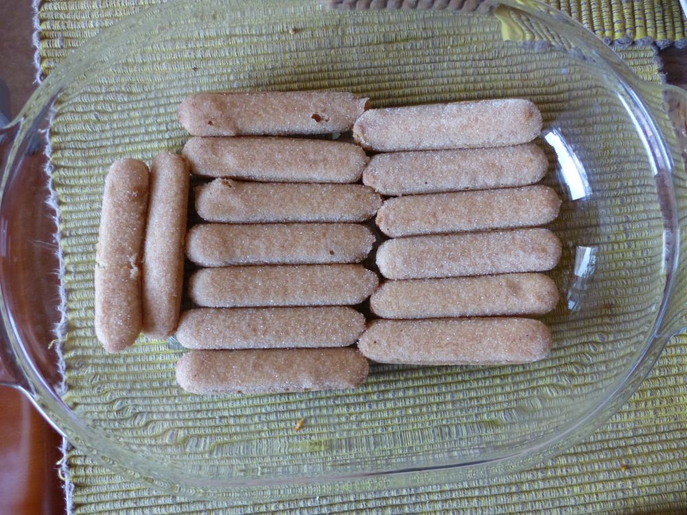5. Dip ladyfingers in espresso mixture and cover bottom of dish Take a ladyfinger, dip the entire thing into the espresso mixture, and place into your oven dish. Repeat this step until the bottom of the entire dish is covered in coffee and liqueur soaked ladyfingers.