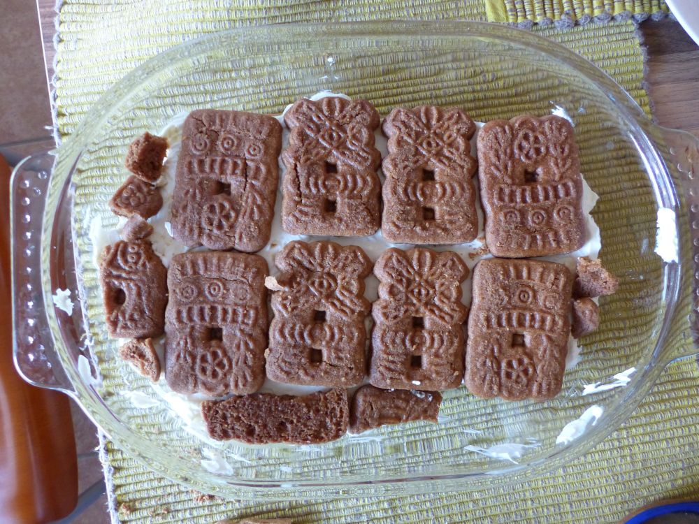 7. Dip speculaas biscuits in espresso mixture and cover mascarpone layer Repeat step 5, but this time use the speculaas biscuits. Cover the entire layer of mascarpone with the speculaas.