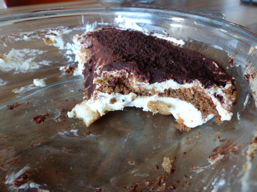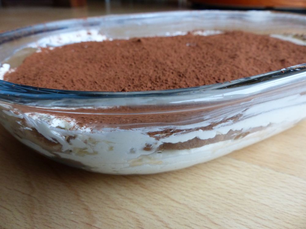 9. Let chill and set in fridge, add cocoa powder before serving Now your tiramisu is pretty much done – it just needs to chill and set in the fridge for at least an hour. Sprinkle the cocoa powder over the tiramisu right before serving. I used a sieve for this, and sieved the tablespoons one at a time over the tiramisu. This way, you’ll get an even layer.
